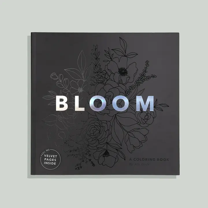 A beautifully designed adult coloring book by artist and muralist, Alli Koch (@allikdesign). Bloom features over 30 hand-drawn floral illustrations on premium paper—perfect for mindful creativity, gifting, and display. With luxe touches like black velvet pages and an iridescent foil cover, this title stands out on shelves and makes an easy impulse buy. • 30+ premium floral illustrations for stress relief and creative expression • Includes 2 black velvet pages for a tactile, mess free coloring experience
